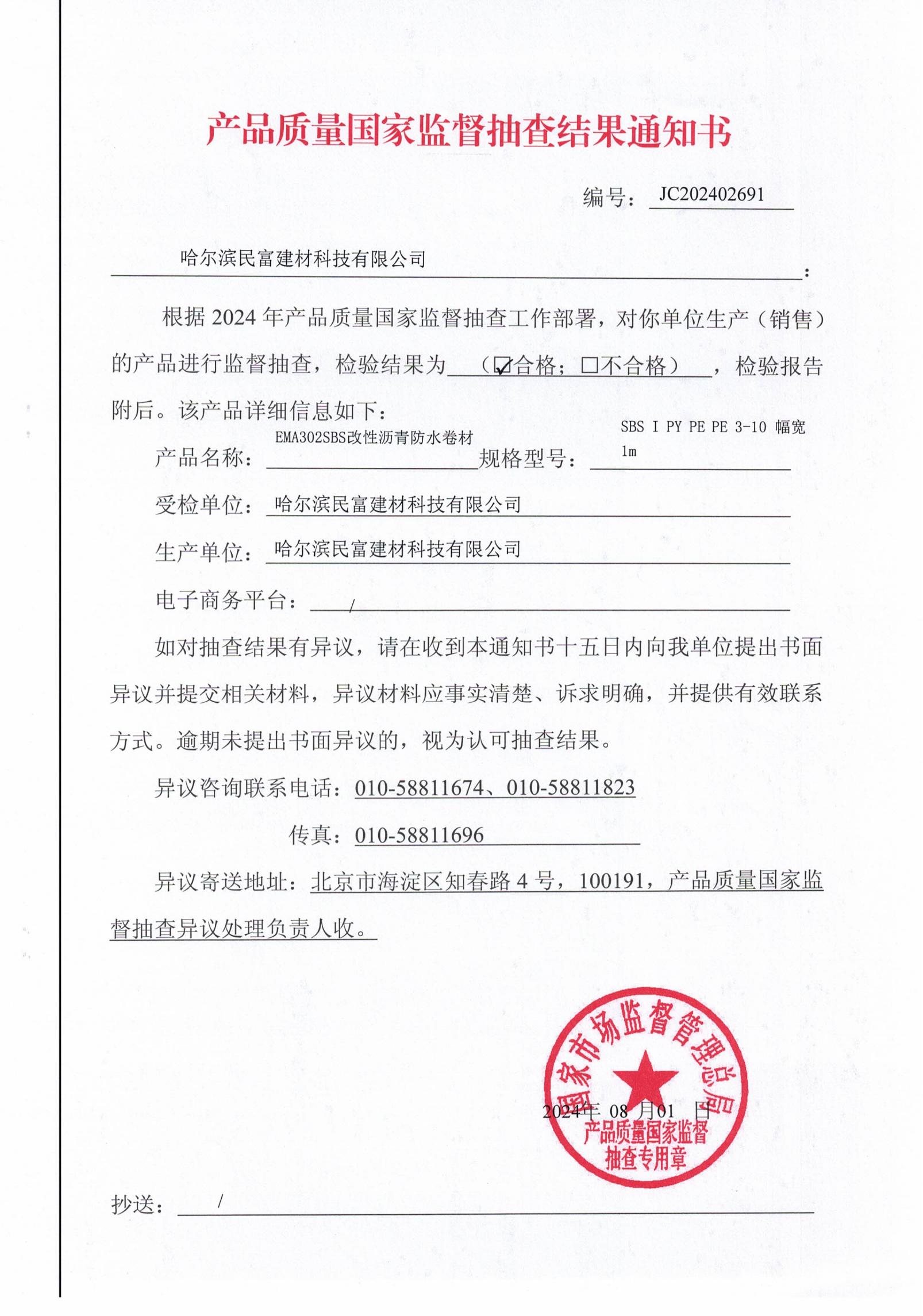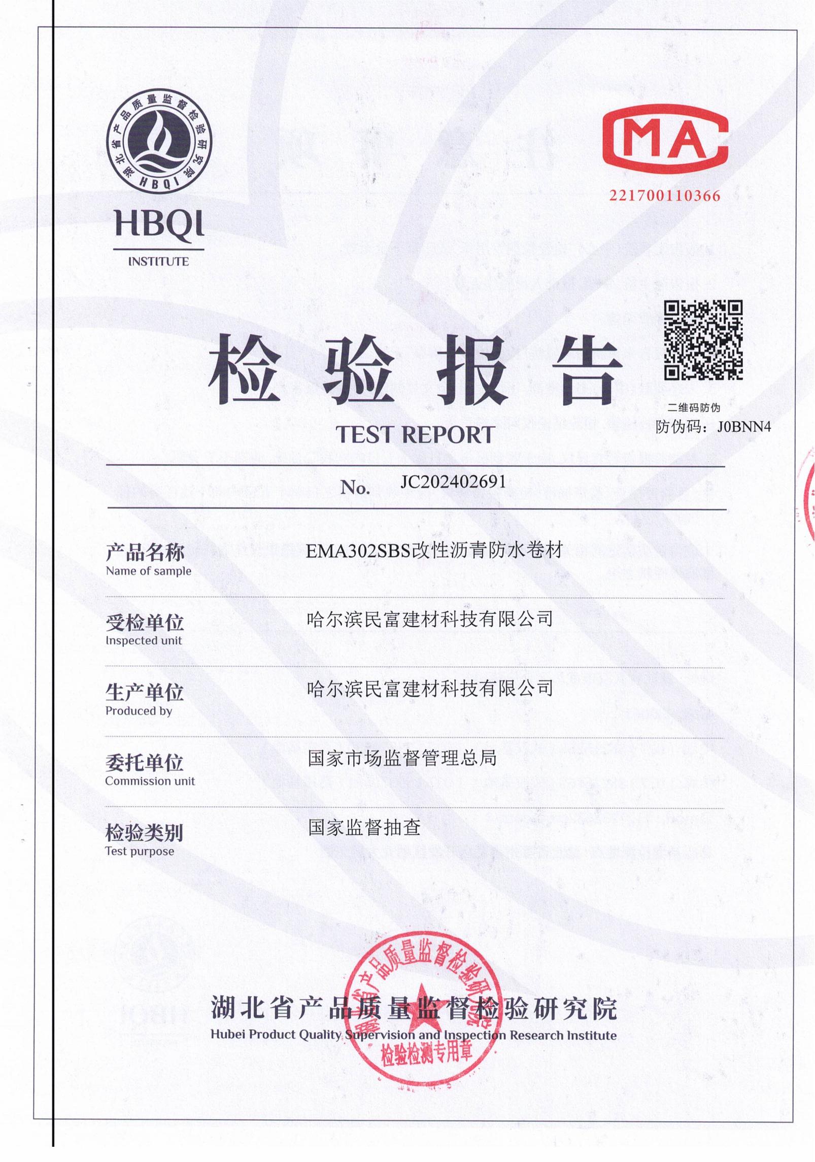 今年6月,國家市場監(jiān)督管理總局委派指定檢測機構(gòu)到民富建材進行產(chǎn)品抽樣檢查。7月31日國家市場監(jiān)督管理總局公布檢測結(jié)果,經(jīng)過權(quán)威機構(gòu)的檢測和驗證,檢測報告顯示民富建材防水卷材產(chǎn)品質(zhì)量在各項指標方面均達到或超過檢測標準,檢測報告清晰的表明民富防水卷材在品質(zhì)性能等方面表現(xiàn)出色。此報告是對民富建材防水卷材產(chǎn)品質(zhì)量的一次審核,也是民富建材對消費者選擇民富產(chǎn)品的堅定承諾。
