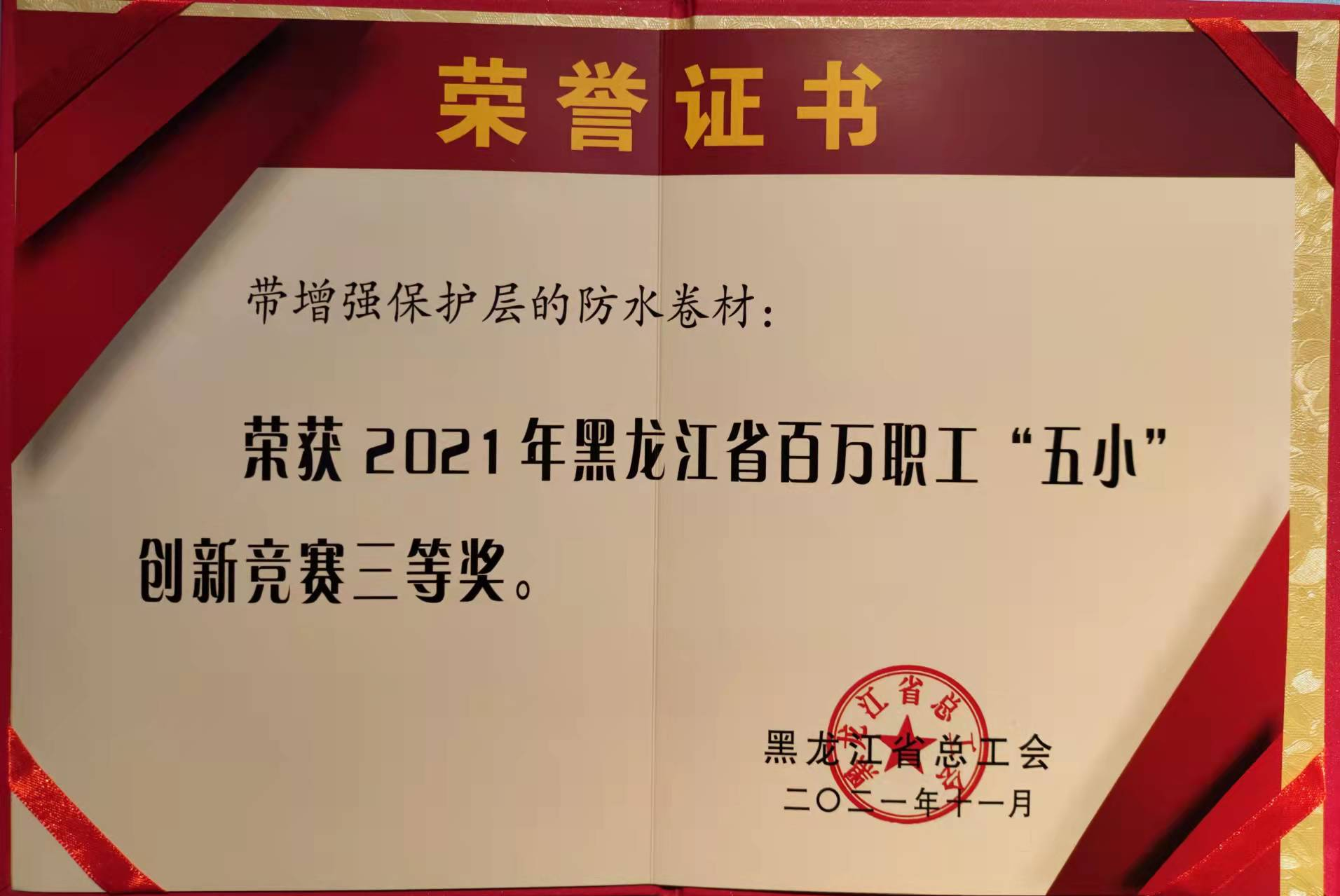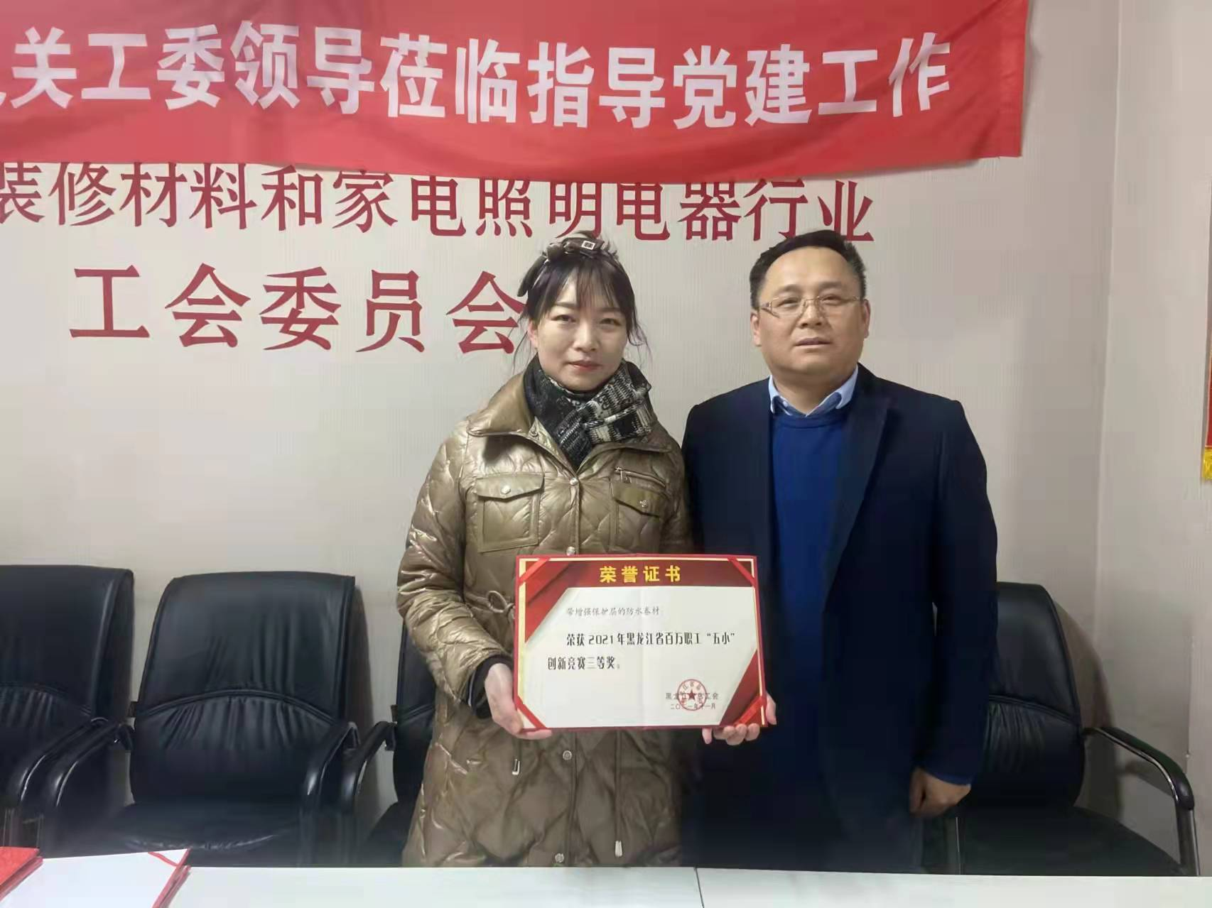 黑龍江省總工會授予民富防水“五小”創(chuàng)新 榮譽(yù)證書 12月21日黑龍江省輕工業(yè)發(fā)展中心主任,黑龍江省裝修材料行業(yè)協(xié)會會長趙勇、辦公室主任劉思瑞為哈爾濱民富建材科技有限公司頒發(fā)了由黑龍江省總工會簽發(fā)的 2021年黑龍江省百萬職工“五小”創(chuàng)新競賽三等獎榮譽(yù)證書。