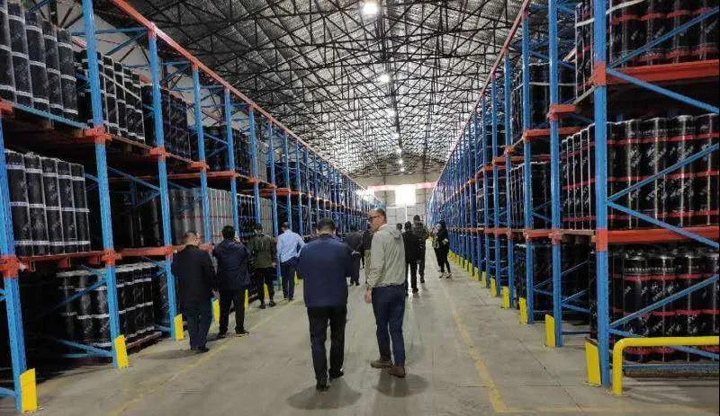他們首先參觀了成品庫房,映入眼簾的是,50萬平米防水卷材井然有序分層擺放著,董事長李建中指著這些成品對老總們說:“這幾天下雨,晴天之后,一兩天,就得拉完,還不夠用呢,還要抓緊生產(chǎn)。”說明成品供不應(yīng)求。